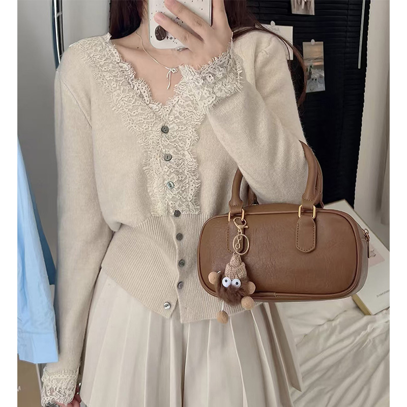 レースvネックセーターカーディガン女性秋冬フランス風優雅風新型デザイン感純色シックニット底シャツ