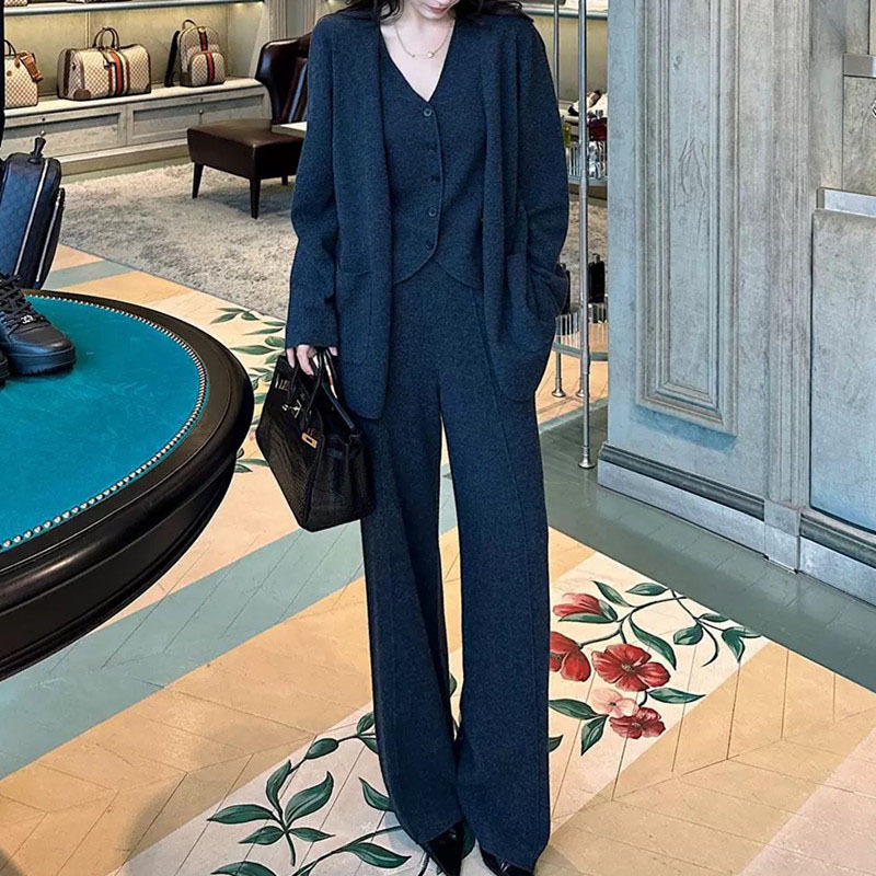 韓国系ニットスーツ秋冬気質通勤クロスボーダーセーター女性新型ベストカーディガンワイドパンツ3点セット