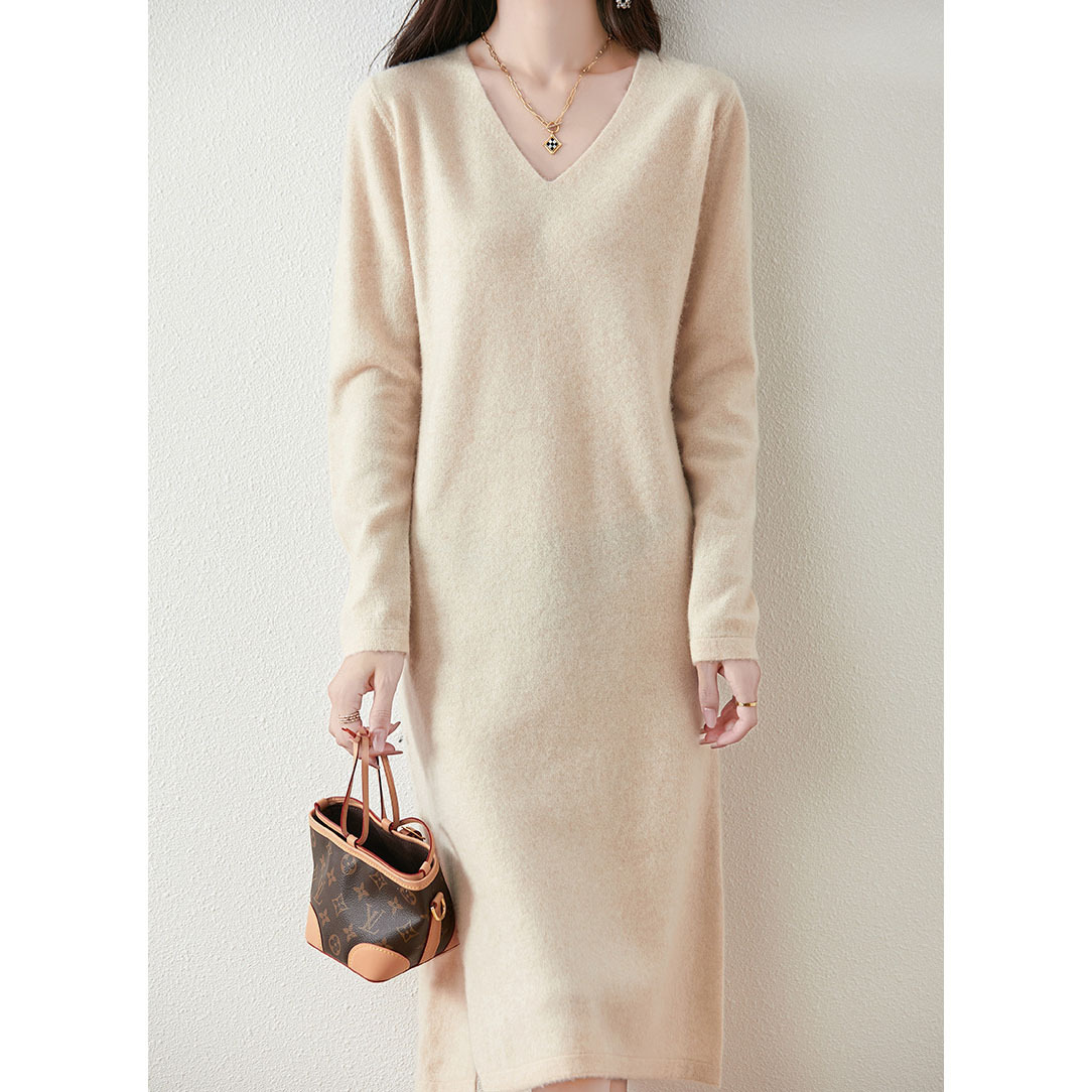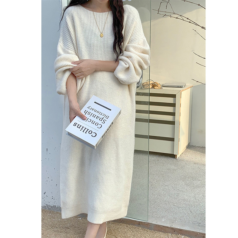 純色の毛のスカートの女性の韓国版のゆったりしている大きい版の型はやせていて怠惰な気質の大きいサイズが膝の丸首のニットのワンピースを越えます。