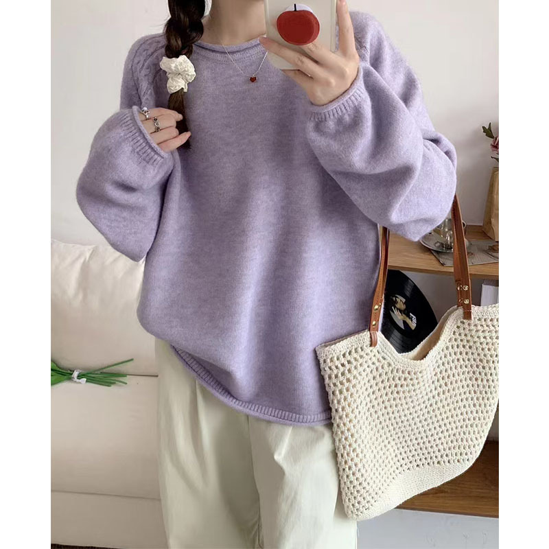 丸首の格子の純色のセーターのロングスカートの女性の韓国版はゆったりしています。