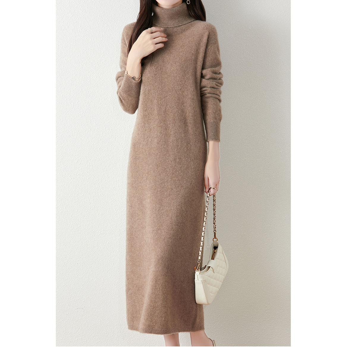 高襟の基礎モデルのセーターのスカートの女性の秋冬の新型の気質の通勤風の長い金は膝を越えて底のニットのワンピースを打ちます。