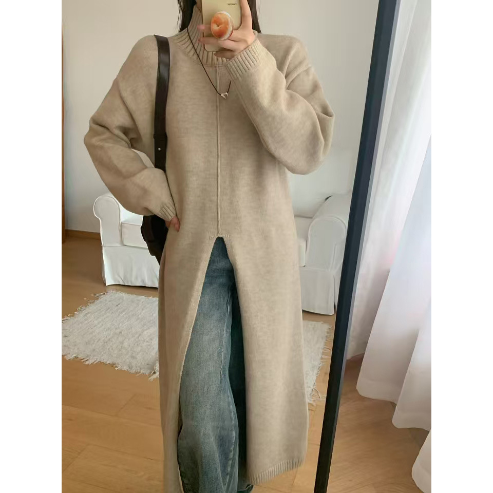 高襟のシンプルな純色のセーターのスカート秋冬韓国版カジュアルなオープンフォークのデザインがゆったりしています。