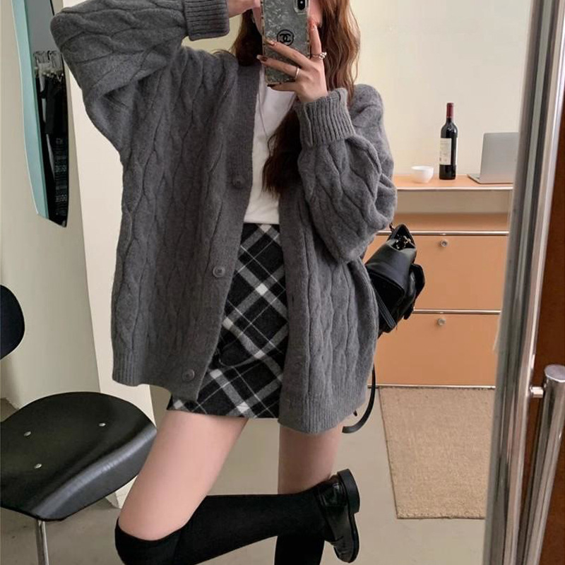 グレーvネックの大きなポケットのセーターのコート秋冬の新型韓国版の怠惰でゆったりした大きいサイズのカジュアルなニットのカーディガンの女性