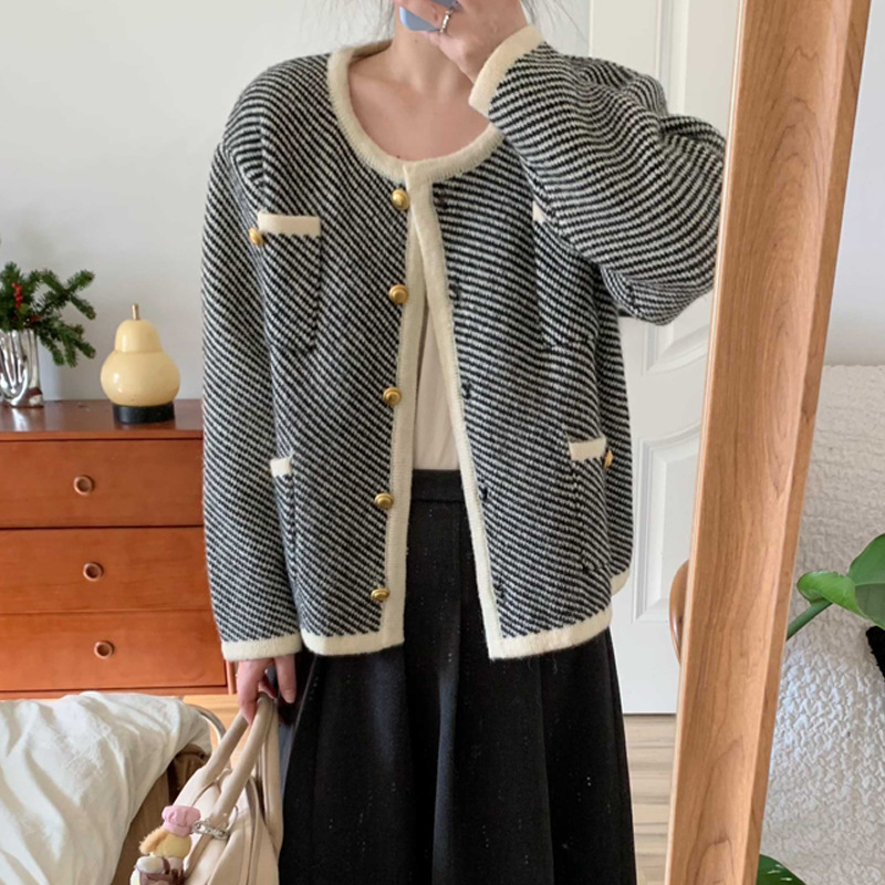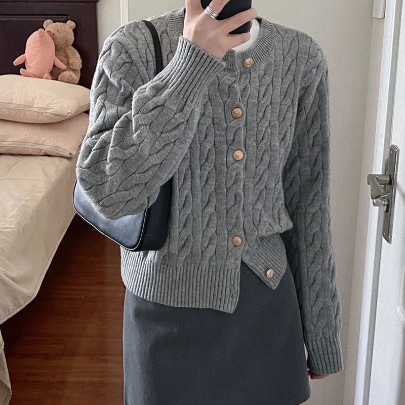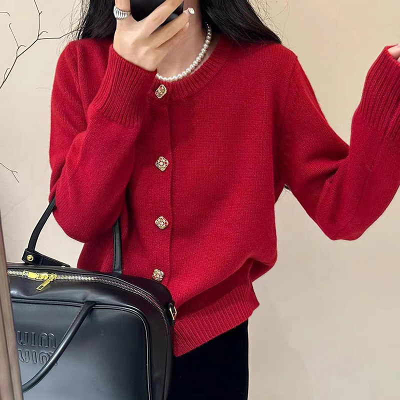 純色のダイヤモンドのボタンの丸首の気質のセーターのカーディガンの韓国系の優しい風の高級感の秋冬の新型のニットの女性