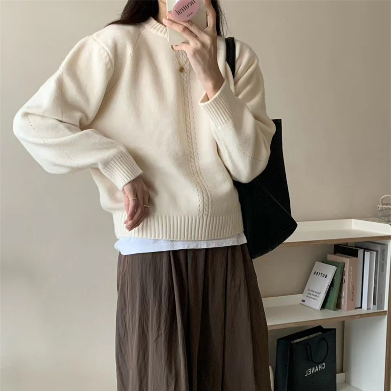 韓系の優しい風の丸首の麻の花のセーターの女性の秋冬の新型のゆったりしている短いタイプはアマゾンに合わせて底のニットを打ちます。