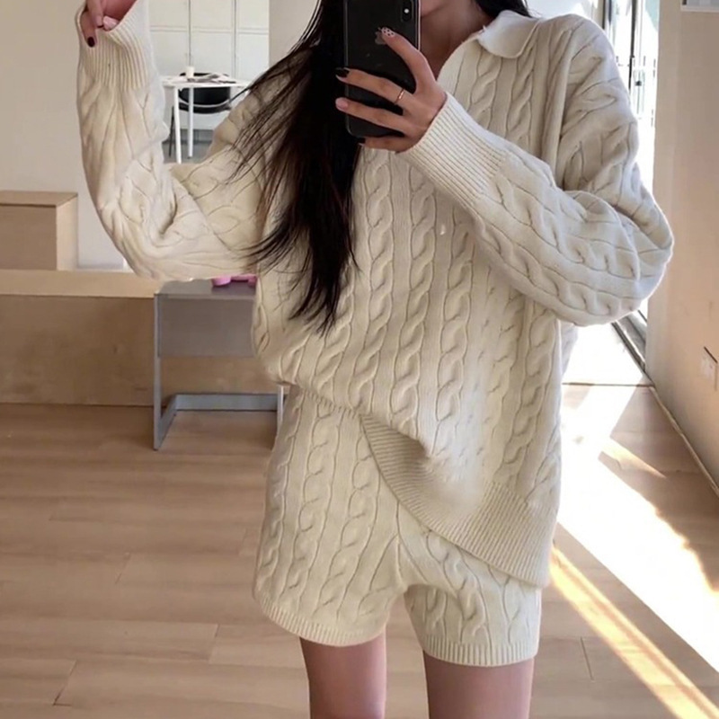 Polo襟麻花セータープルオーバーニットショーツ2点セット韓国版秋冬新作カジュアルニットセット