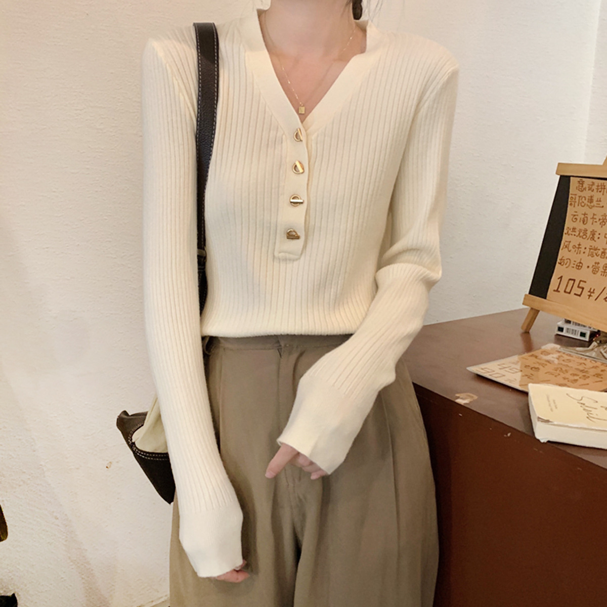 Vネックの底のセーターの金属のボタンの設計2024秋冬の韓国版の百合の高級感のニットの女性のニット
