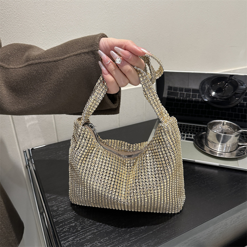 手にダイヤモンドを入れて金属のスパンコールを入れて、小さなバッグを包んで、高級感があります。