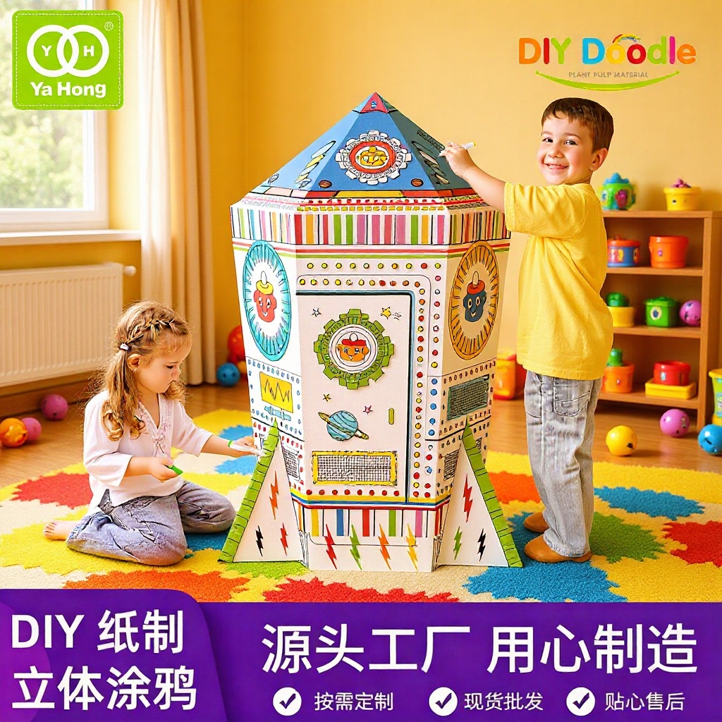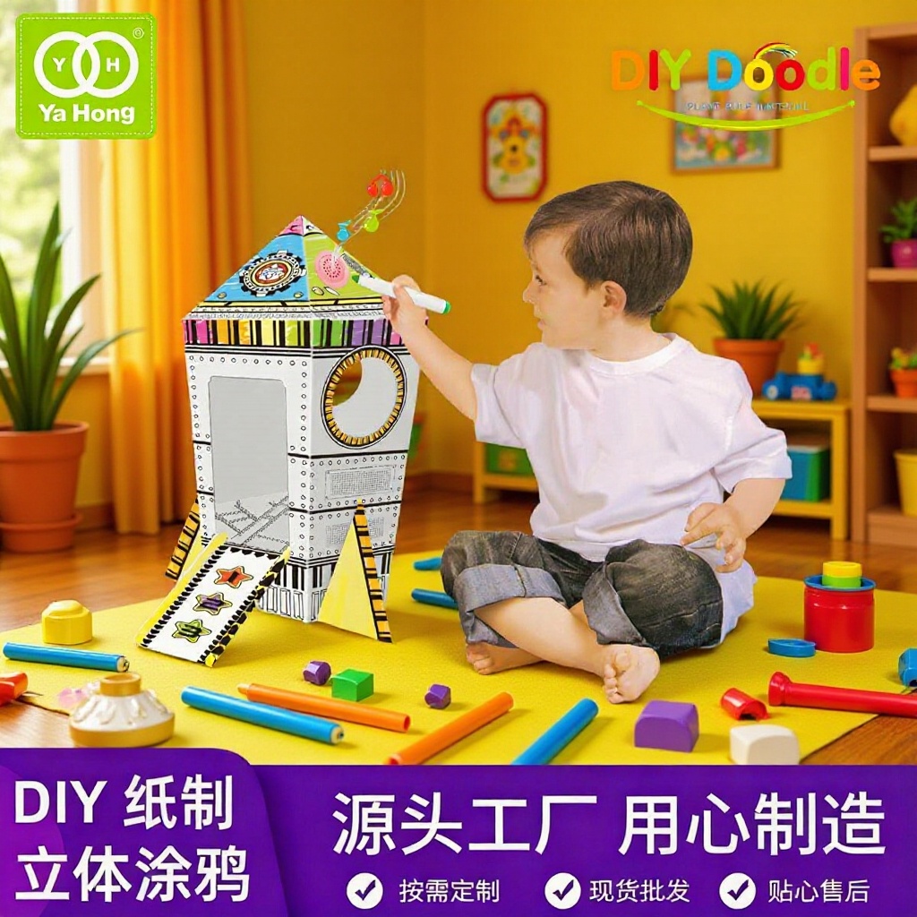 工場直販 子供用段ボール3D落書きセット 手描き紙の家のおもちゃ DIY小屋 絵画ロケット