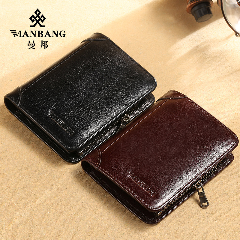 クロスボーダー代発マンバン男性財布ショートタイプのオイルレザーのトップ層牛革小銭袋ファスナー多カードの財布