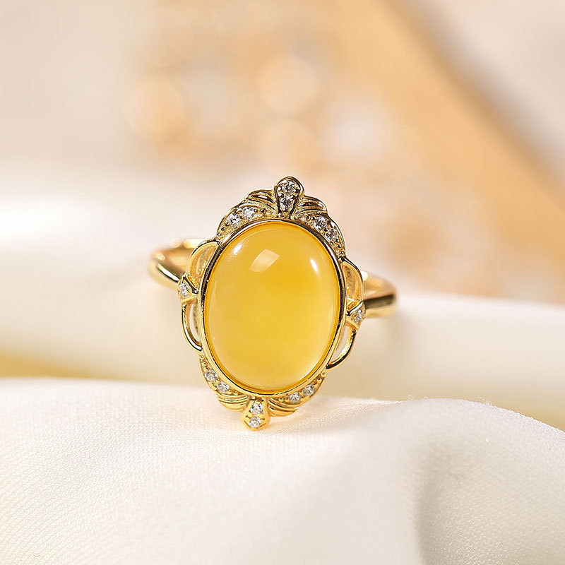 S925純銀金メッキ天然琥珀蜜ろう指輪個性軽贅沢ファッション女性開口指輪