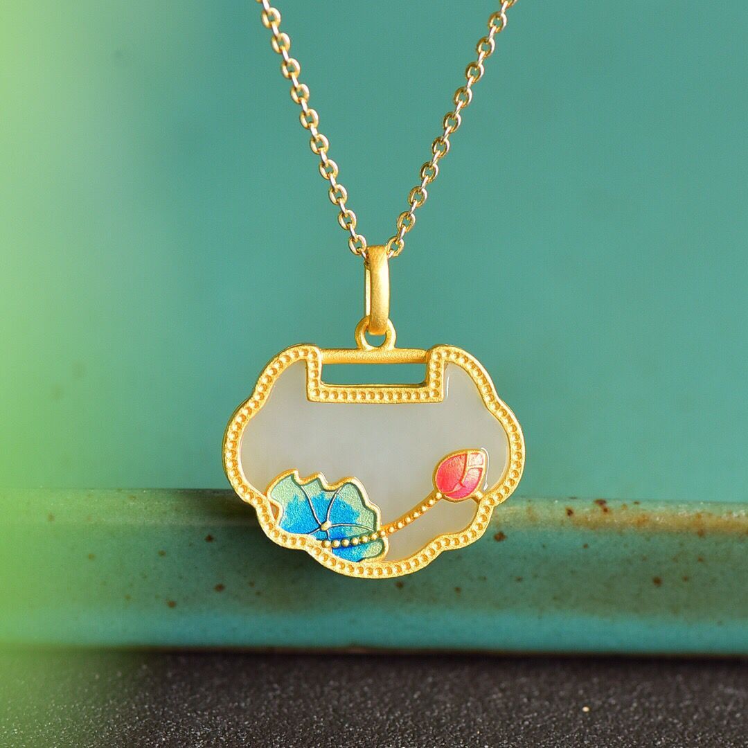 925純銀軽豪華和田白玉如意ネックレス女ハスの花長命ロック中国風玉ペンダント鎖鎖アクセサリー