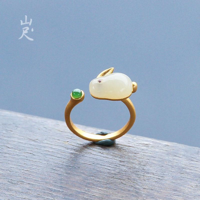 翡翠のウサギの指輪、天然和田玉の小さなウサギの指輪、翡翠の白いウサギ、誕生日プレゼント、干支