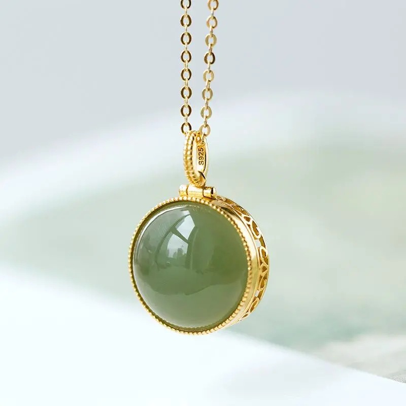 和田玉風香箱、ガウ箱、香袋、透かし彫り、上品でファッショナブルな女性用ペンダント、開閉可能、金メッキネックレス