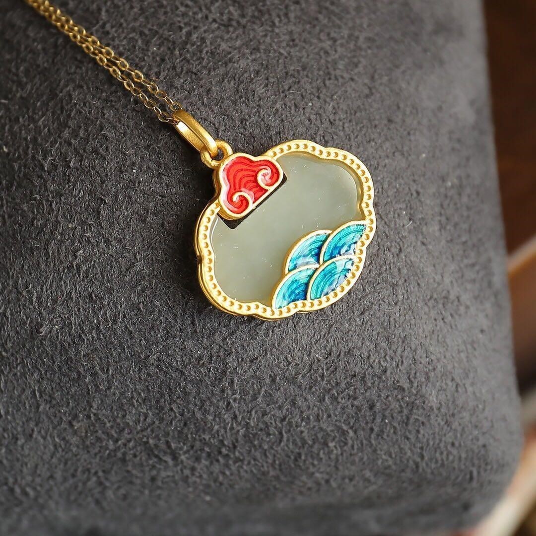古法焼藍s925純銀の金白玉ペンダントエナメル彩如意祥雲復古風気質ロックネックレス