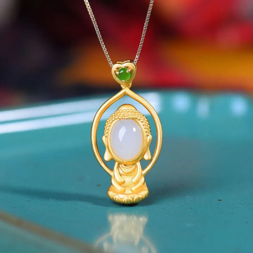 925純銀玉萌色碧玉ペンダント女性首飾り無相仏赤ちゃん仏と田玉銀は鎖鎖をはめ込んでいる