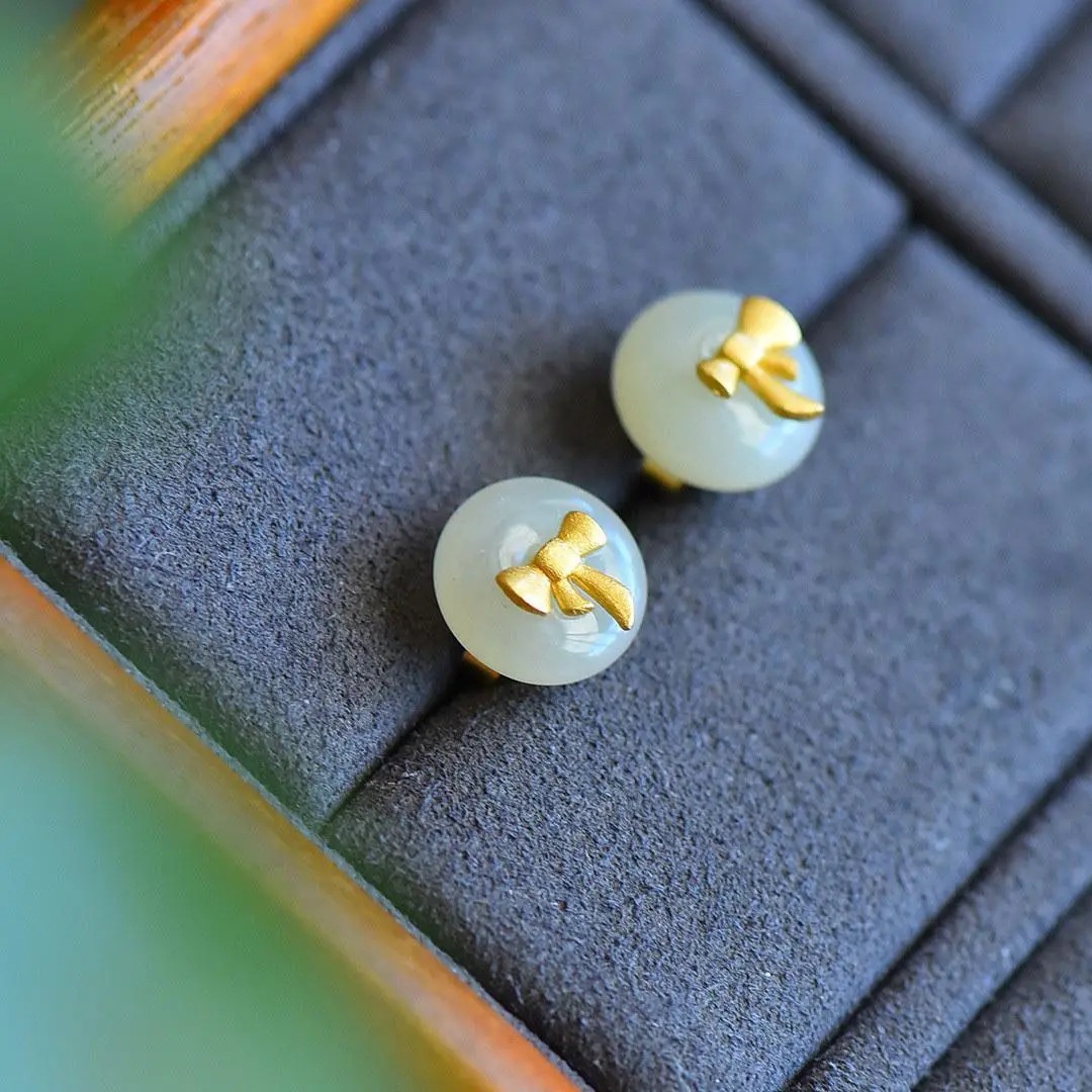 S925銀針蝶結びと田玉ピアスのアレルギー防止精致平安ボタンの耳飾りシンプルで小さい女性のアレルギー防止