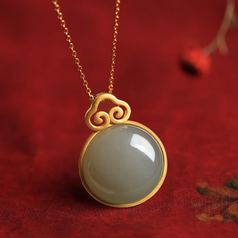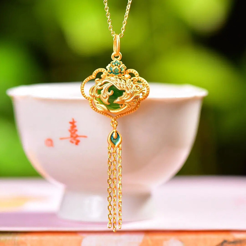 レトロ宮廷風碧玉円卵面ペンダントs925銀金メッキ個性レトロ鳳凰流蘇如意錠ペンダント