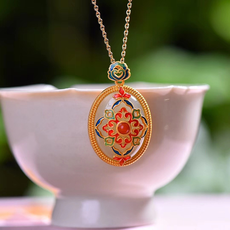 オリジナルデザイン古法銀モザイク天然和田玉碧玉卵面エナメル中国風民族風ペンダント女性