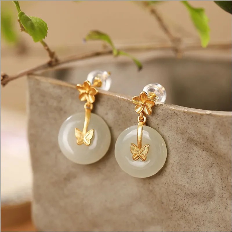 蝶舞懐古925銀金メッキ和田玉平安ボタン蝶イヤリング花型古風優雅ピアス銀飾り
