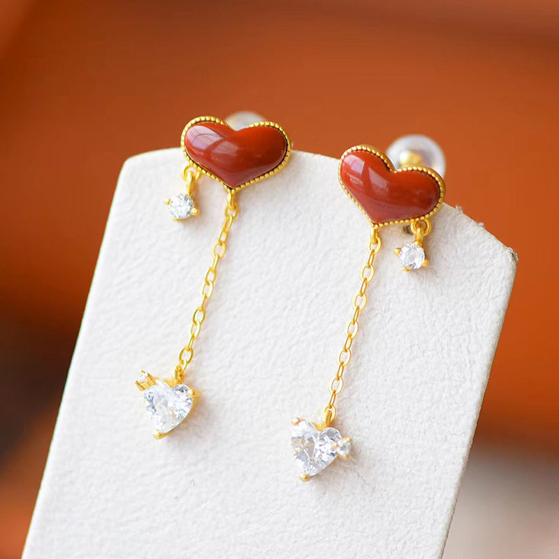 レトロでエレガントな南紅瑪瑙のイヤリング、フリンジ付きのハート型、幾何学模様の金メッキ、女性用イヤリング、多用途