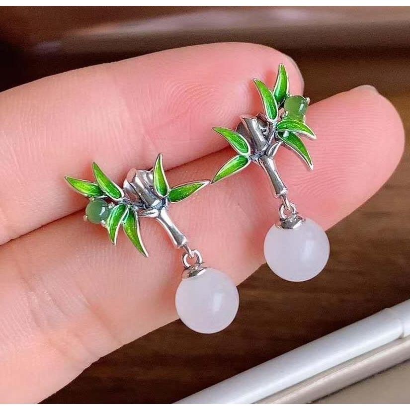 天然白玉イヤリング女性純銀緑竹葉ピアスレトロ中国風焼青エナメルイヤリング女性