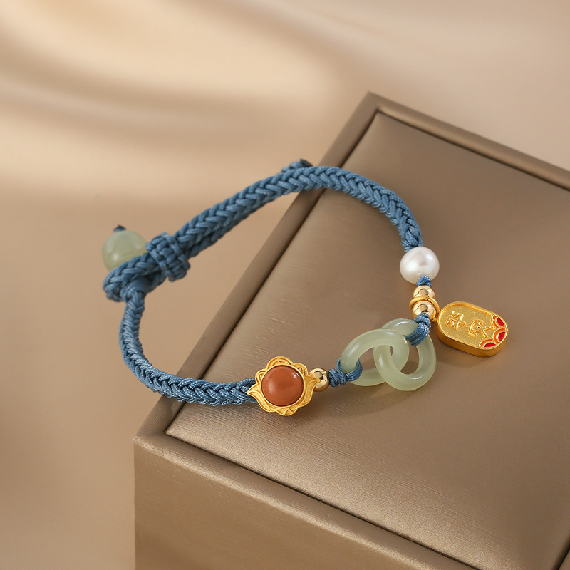 オリジナルデザイン天然和田玉双環月光石環環相ボタン平安手縄女ブレスレット調節可能