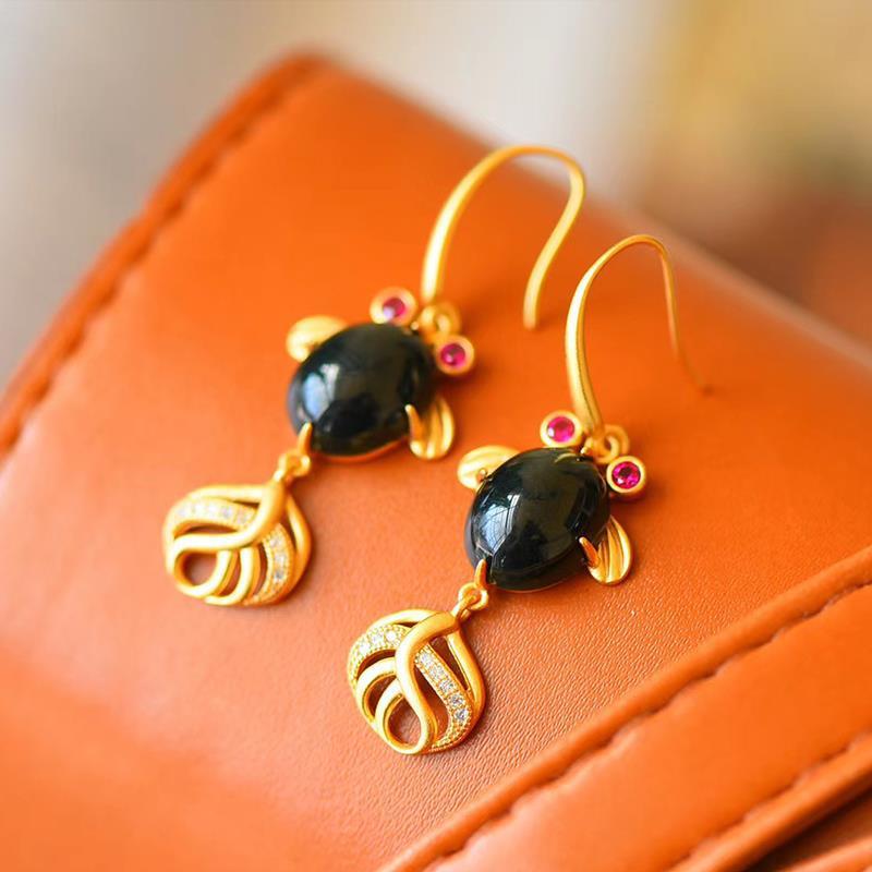 新商品中国風玉墨玉錦鯉耳飾り925銀金レトロ耳飾り女性ロングイヤリング