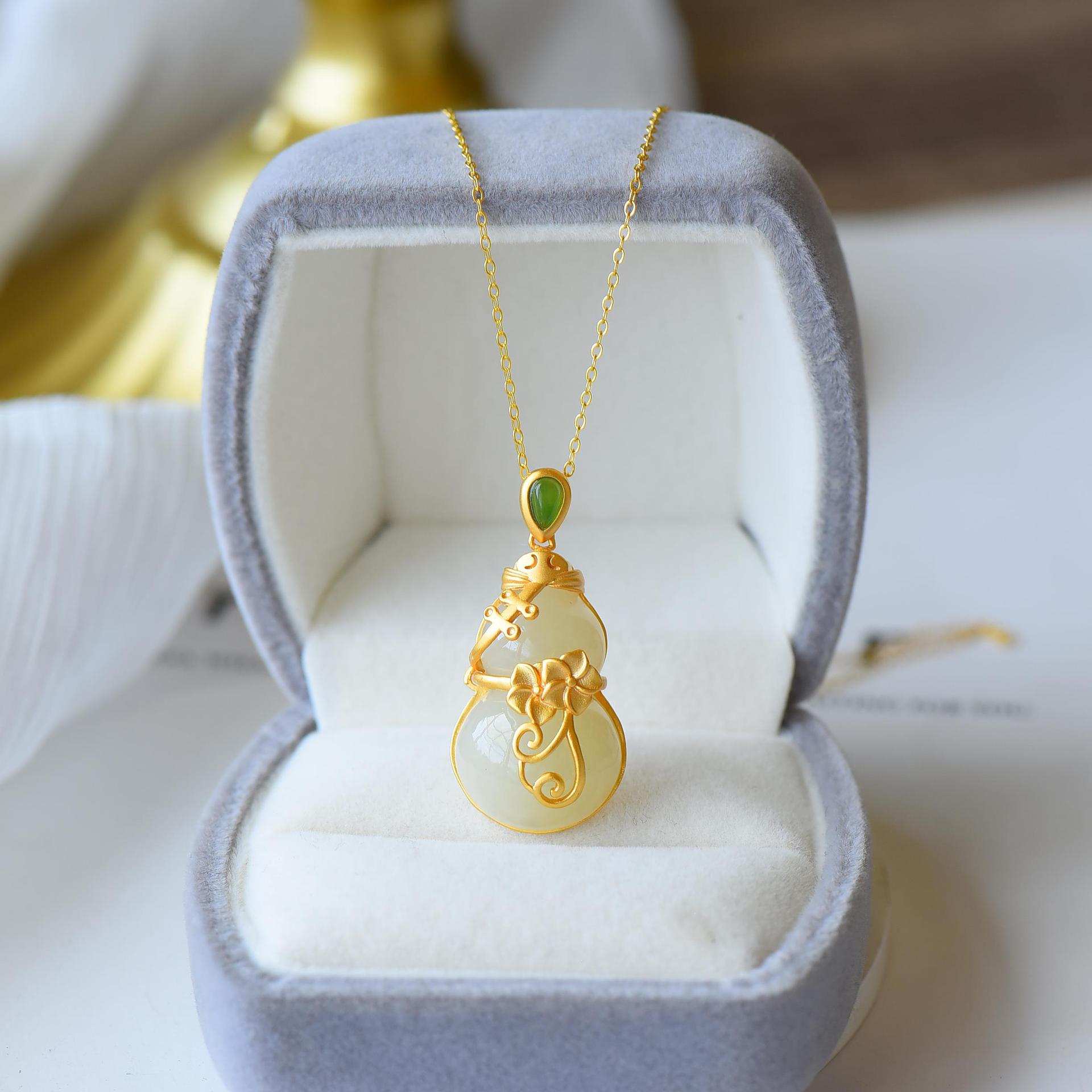 玉瓢箪天然和田玉碧玉瓢箪ペンダントs925純銀金メッキ玉ネックレスプレゼントレトロ