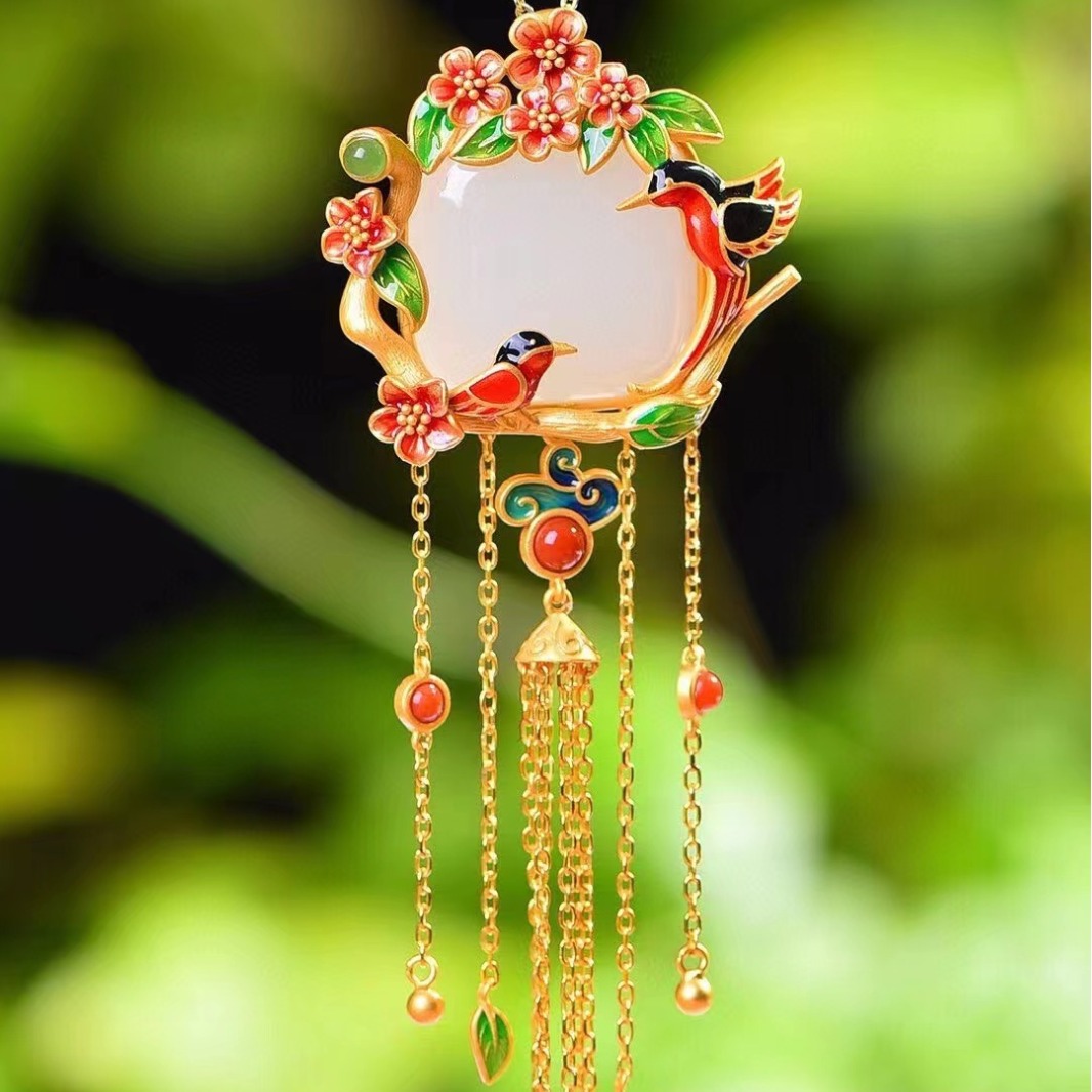 エナメル喜上眉先白玉金メッキペンダント中国式古典民族風女性タイプペンダントネックレス高級感玉ペンダント