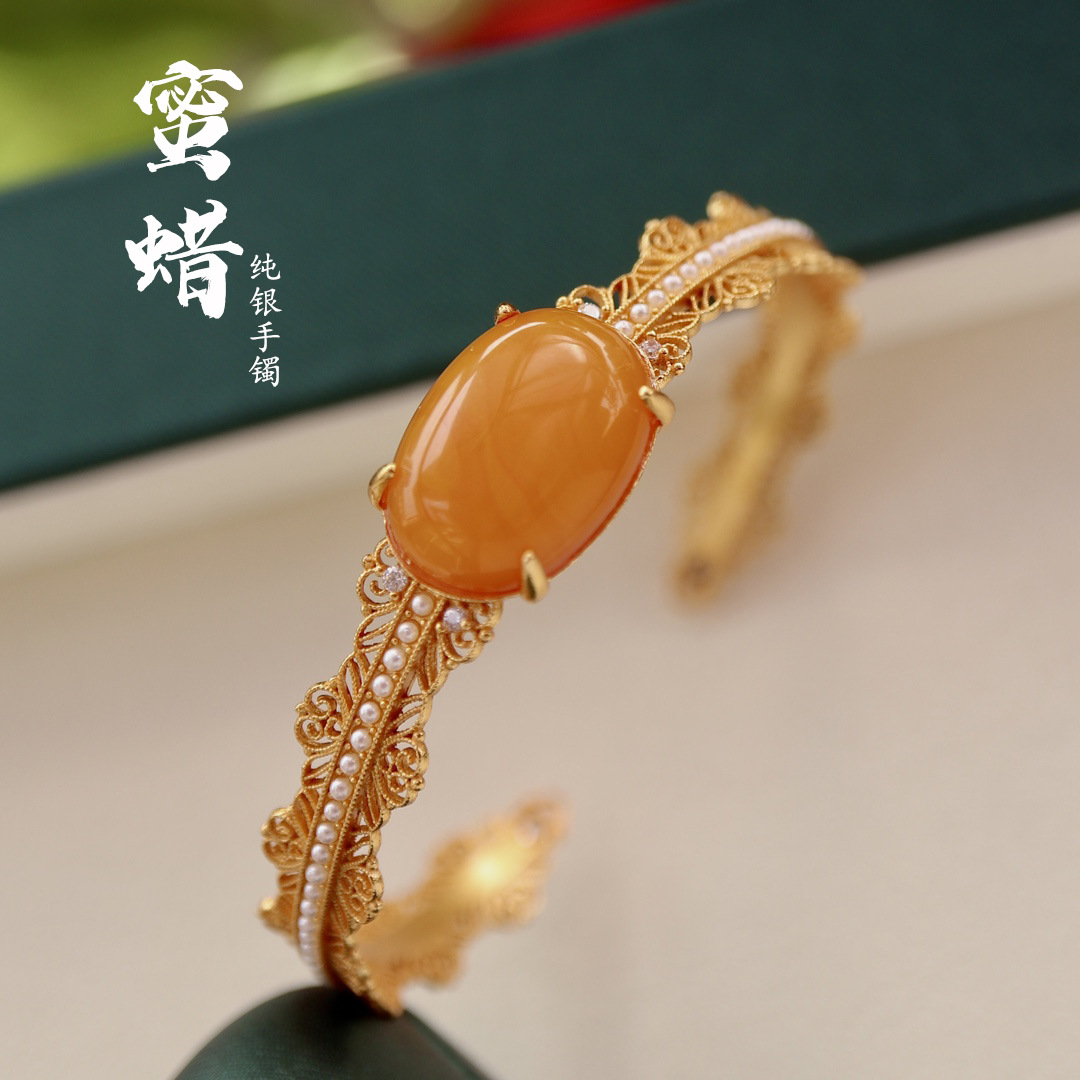 天然老蜜ろう手串高品妖花老ろうブレスレット南紅S925銀オリジナル鑑定証明書