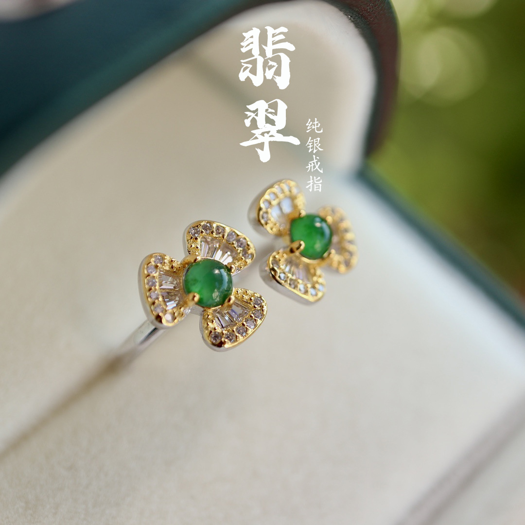 天然翡翠指輪925純銀a類素輪双花正品真証明書危険材料本物の女性大衆は調節できる