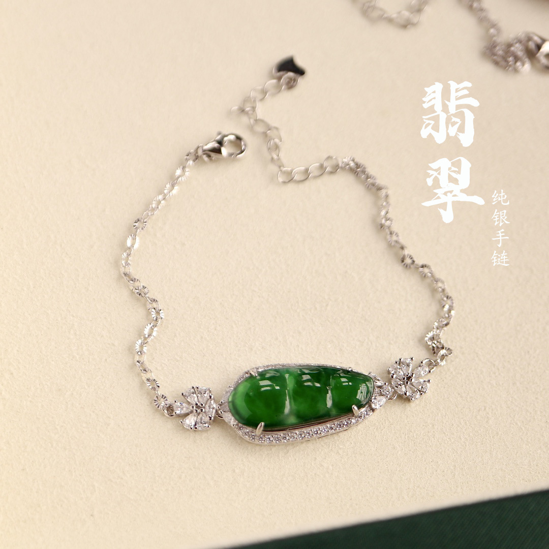 天然翡翠ブレスレットa材料天然本物925銀陽緑翡翠福豆高商品銀装飾真証書高級感
