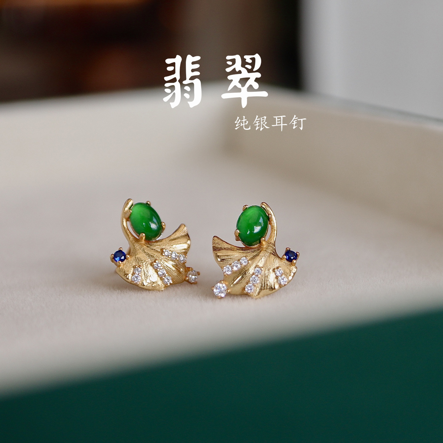 天然a料翡翠银杏叶耳钉通体925银阳绿蛋面高级感现货批发节日礼物