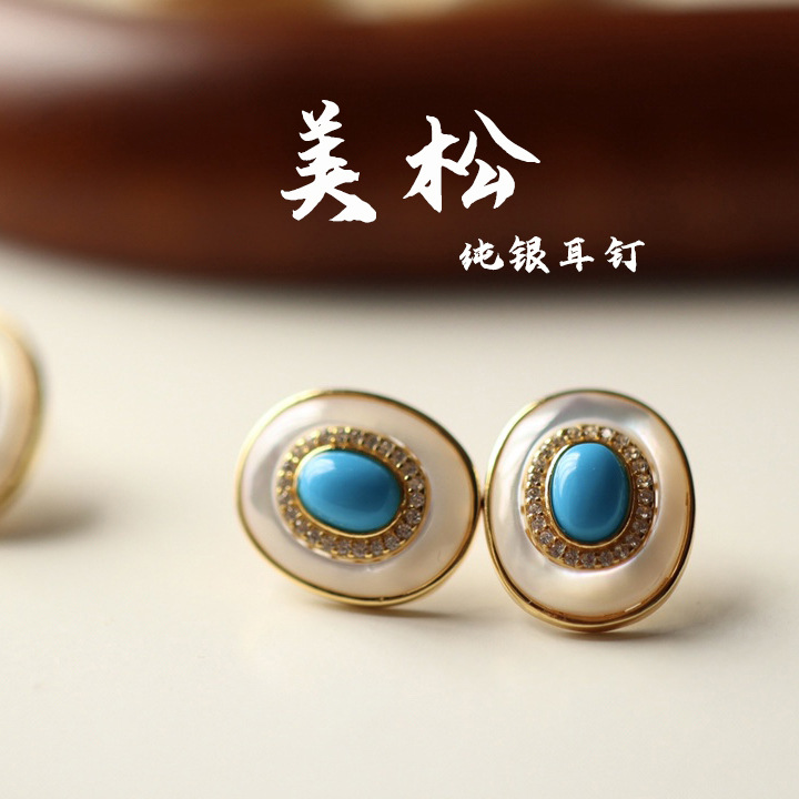 天然美松緑松石ピアスS925純銀モザイク白貝母耳飾り高級感復古香港風女小衆
