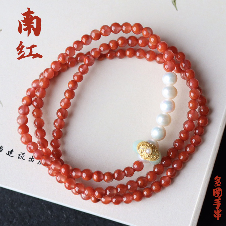 メーカー卸売り天然南紅手串川料高品無加色保真ブレスレット3周女性軽贅沢デザイン金