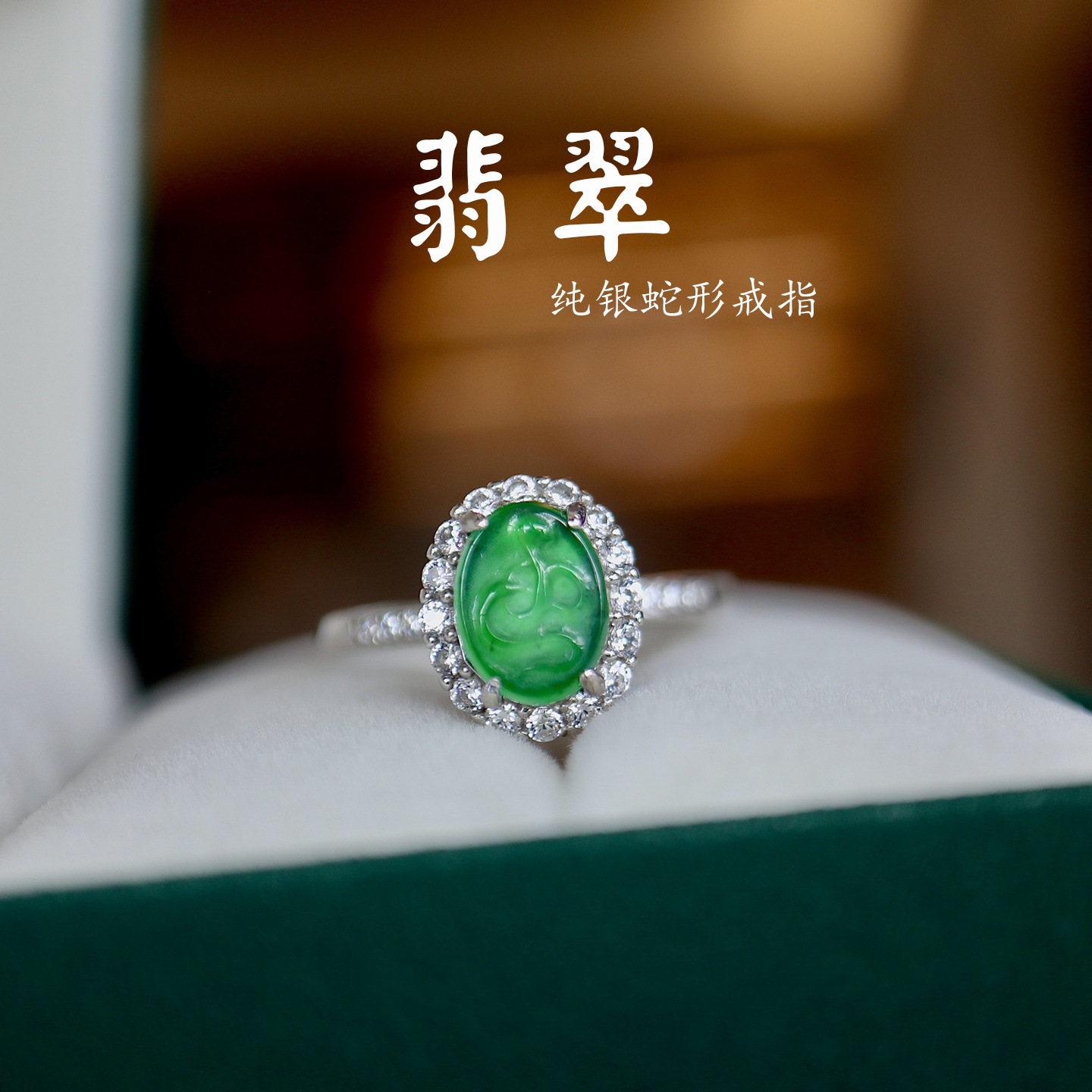 天然a货翡翠蛇形戒指925纯银镶嵌蛋面雕刻现货批发本命年送闺蜜礼