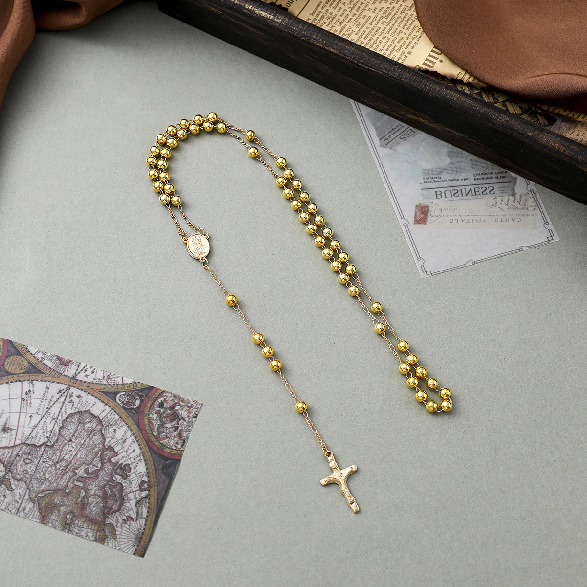 クロスボーダー男女洗礼数珠6mm金色の鉄の丸い玉の手作りの丸い玉のチェーンのネックレスの十字の長いネックレスのアクセサリー