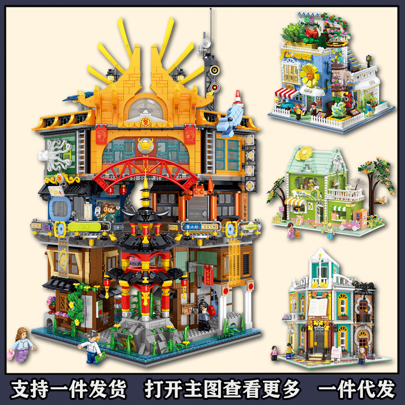 哲高大型都市街並み積み木青レモンティー店商店街モデルminiクロスボーダー小粒組み合わせ玩具