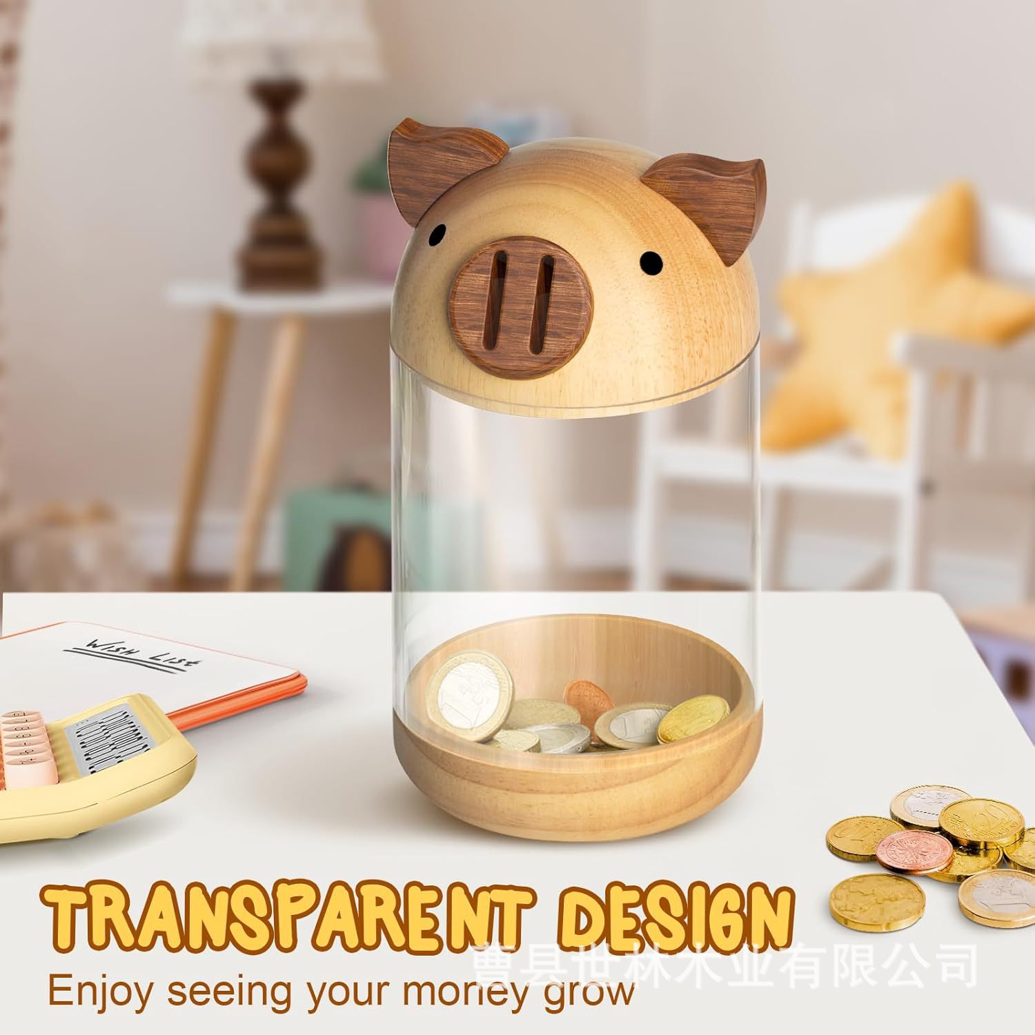 国境を越えた漫画の豚の貯金箱木製円筒形垂直コイン収納ボックス透明コイン貯金箱