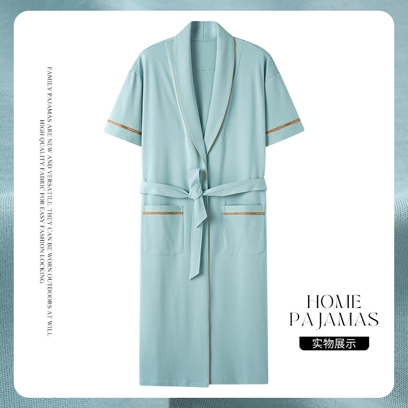 寝衣男夏の薄手純綿半袖カジュアルゆるい夏の中の長いバスローブの大きいサイズの家庭服パジャマ男