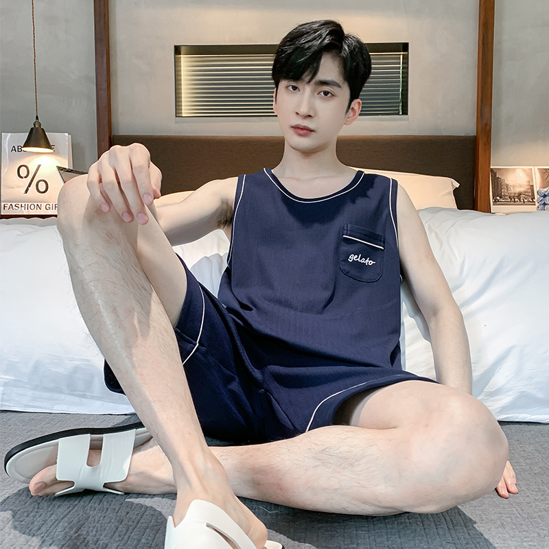 メンズパジャマ、メンズ夏用純綿ベストショーツ、薄手スーツ、ノースリーブ、大きいサイズ、屋外で着用可能、夏のホームウェア