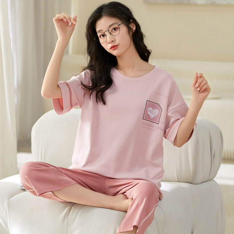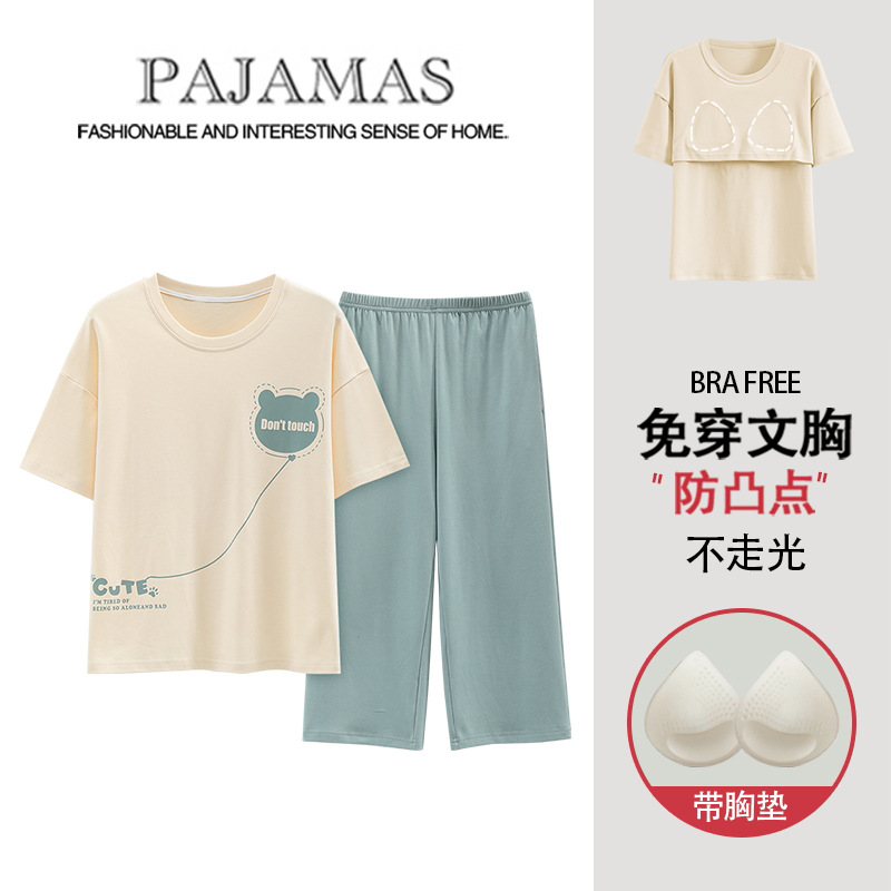 女性用胸パッド付きパジャマ、夏用純綿半袖クロップドパンツ、夏の女の子が外で着用できる高級ホームウェアセット