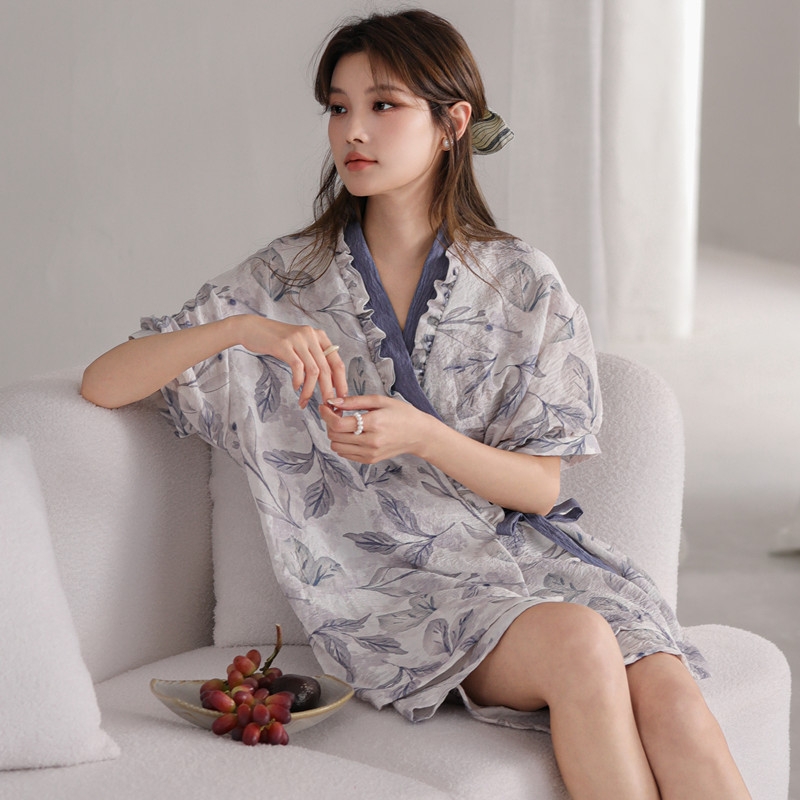 韓国風のシンプルな女性用パジャマ、夏の雲綿半袖着物カーディガン、女性用アウターウェアホームウェアセット