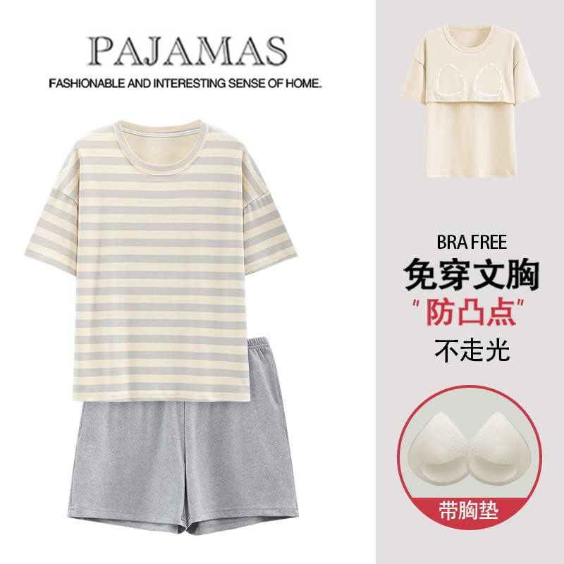 2025新型胸パッド付きパジャマ女性夏綿半袖パンツ夏薄い綿家庭服セット