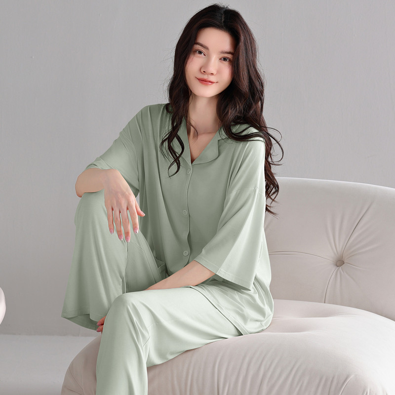 モーダルパジャマ女性2025年新夏半袖長ズボン夏薄手カーディガン住宅服セット卸売り