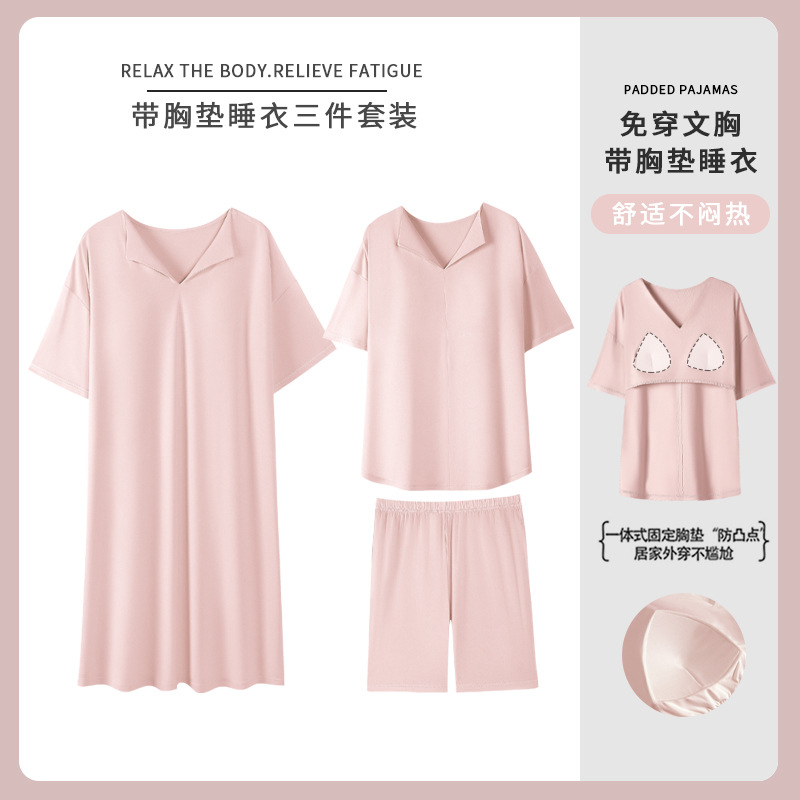 モーダルパジャマ女性モデル2025年新夏胸パッド付き半袖パジャマホームウェア3点セット