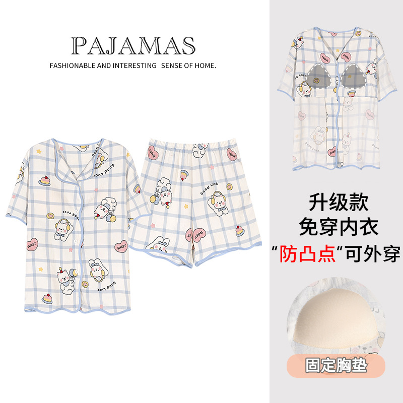 2025新型パジャマ女性夏は胸パッド付きの薄い半袖カーディガンが可愛いです。