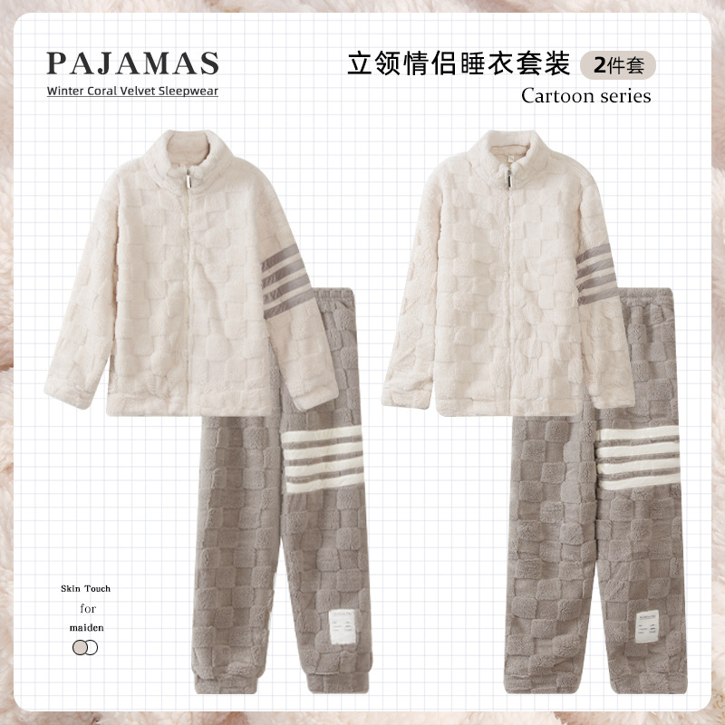 「厚いベルベット」カップルパジャマ冬のサンゴのベルベットの男性と女性の高襟ジッパー保温パイルルーム服