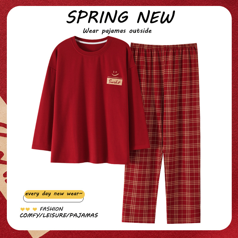 パジャマレディース春秋純綿丸襟長袖長ズボンレッド本命年5XL特大サイズ外着ホームウェア